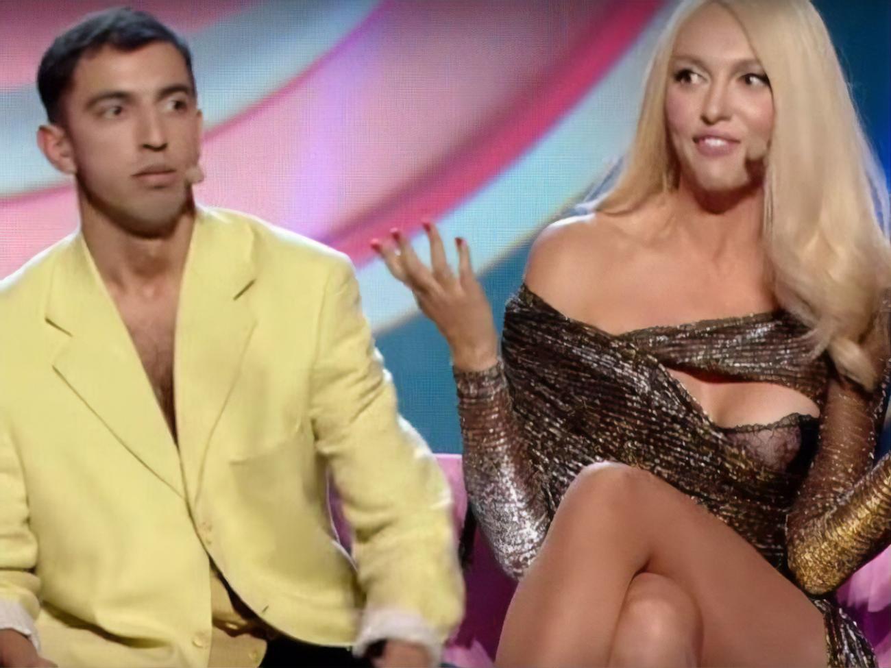 Поцелуй артистов можно посмотреть, начиная с 10.00 минуты видео. После поцелуя певица заявила тогда, что «муж ее дома засмеет после этого«.