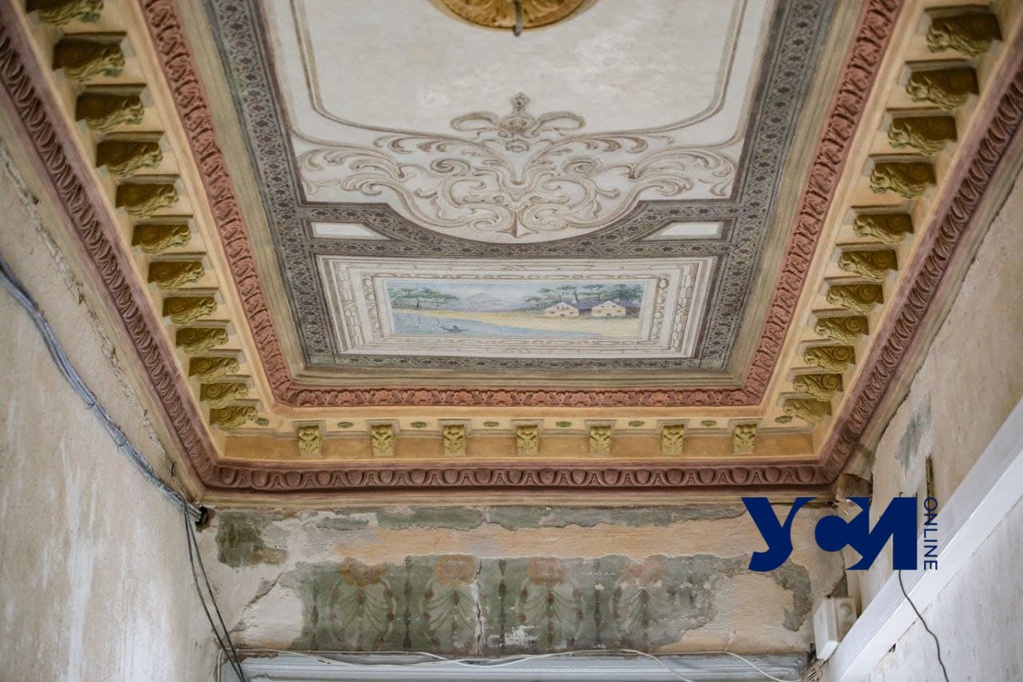 В одном из подъездов дома №3 в Лютеранском переулке заканчивают восстанавливать уникальную роспись на потолке. Деньги на реставраторские работы собрали сами одесситы.