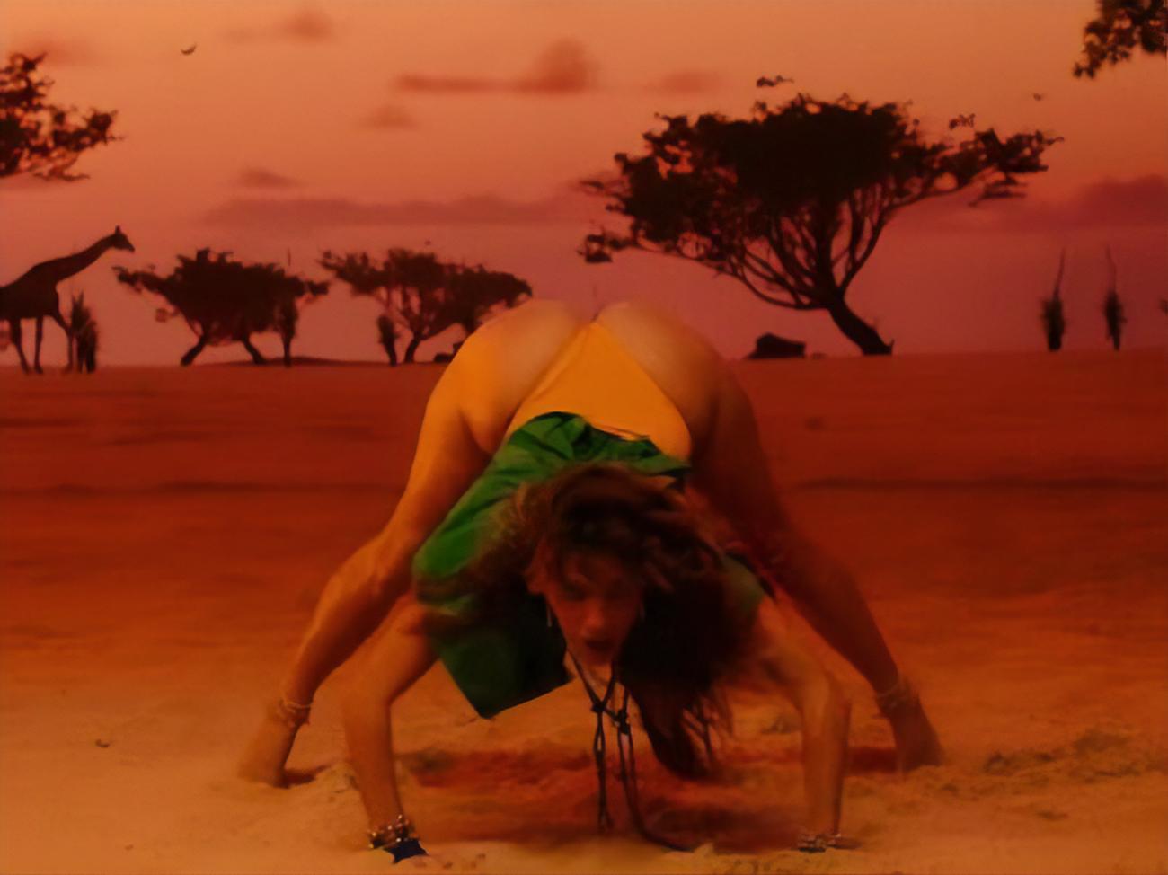 В ролике исполнительница предстала в нескольких разных образах. В желтом купальнике она устроила на танце зажигательные танцы с приседаниями, наклонами и разведением ног.
