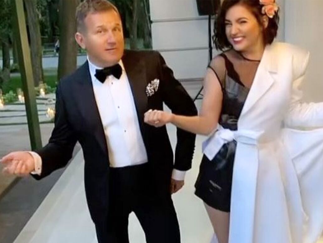 В ролике Горбунов в классическом смокинге с бабочкой и Цибульская в необычном наряде – наполовину платье, наполовину шортах, – ритмично танцуют под песню «Цветочек» из телесериала «Сваты».
