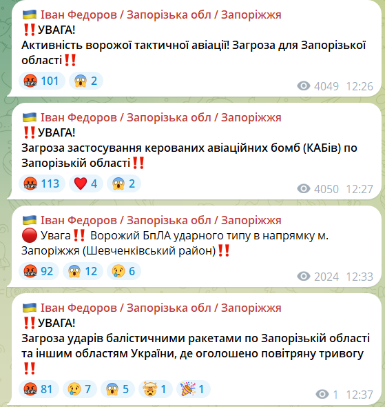 На Олександрівському напрямку агресор атакував п’ять разів, у районі Вербового та у бік Олександрограда, Данилівки, Нового Запоріжжя. Авіаудару керованими авіабомбами зазнала Маломихайлівка.