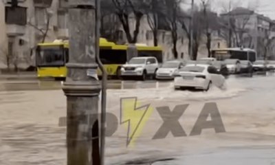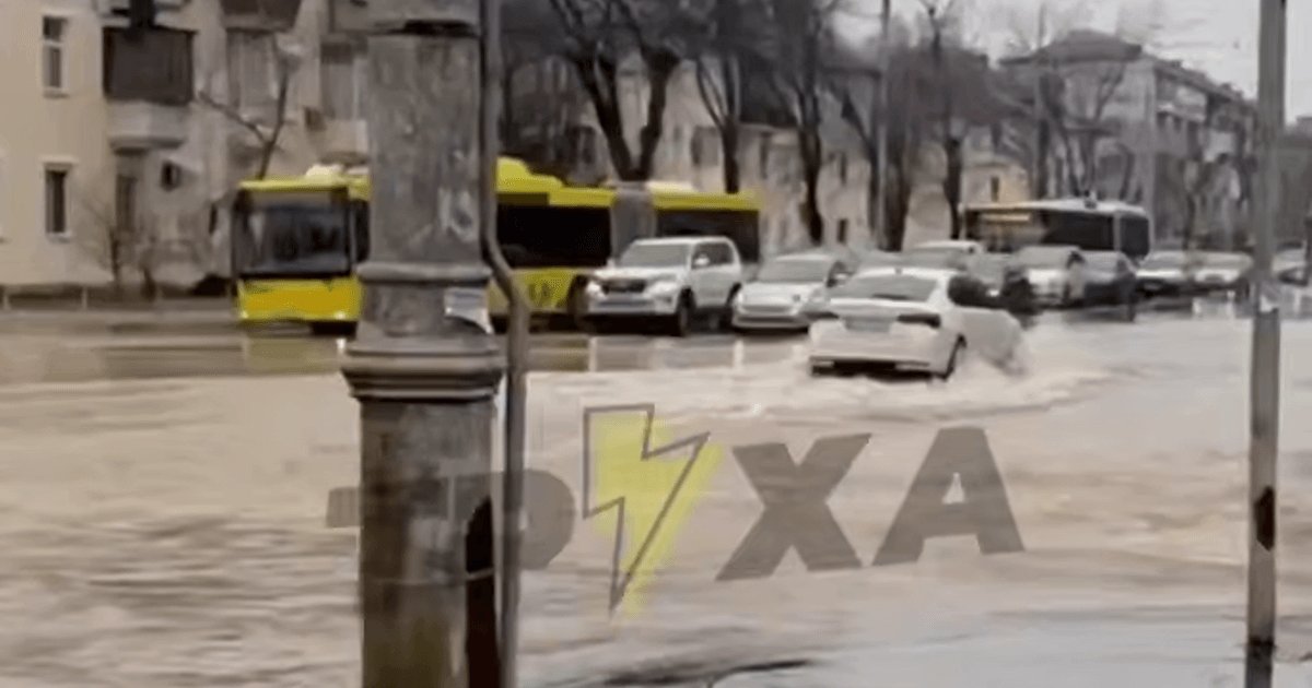 Вулицю заливає водою, а машини, карета “швидкої” і тролейбус буквально пливуть дорогою. Відповідні кадри публікують місцеві Telegram-канали.