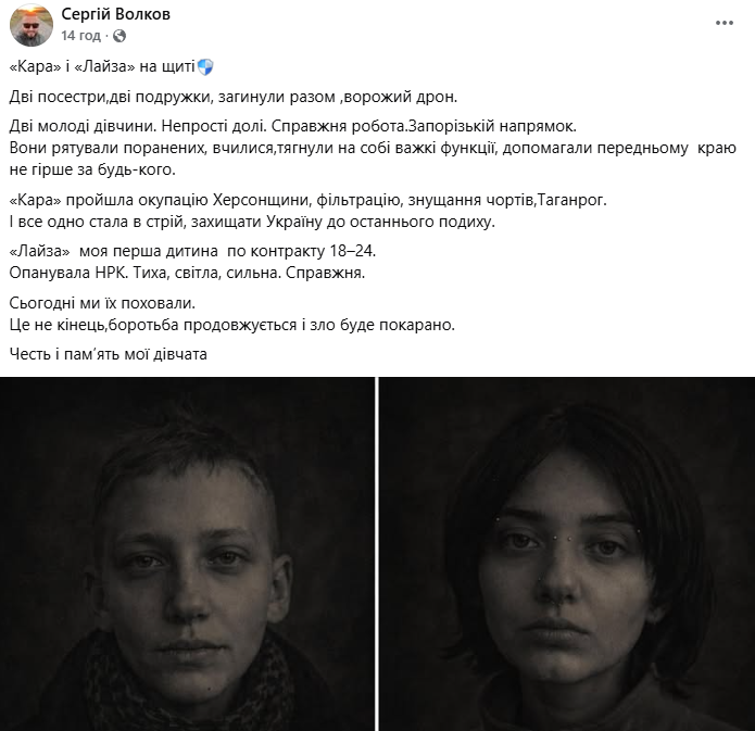 “Карa” і “Лайза” на щиті. Дві посестри, дві подружки, загинули разом — ворожий дрон”, — повідомив командир.