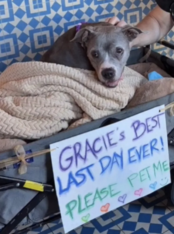 Господарі поклали її у візок, застелений ковдрами, і прикріпили табличку з написом: “Найкращий останній день у житті Грейсі. Будь ласка, погладьте мене”. Їхній маршрут почався з першої кав’ярні, куди Майкл привів її в день, коли вона стала його собакою.