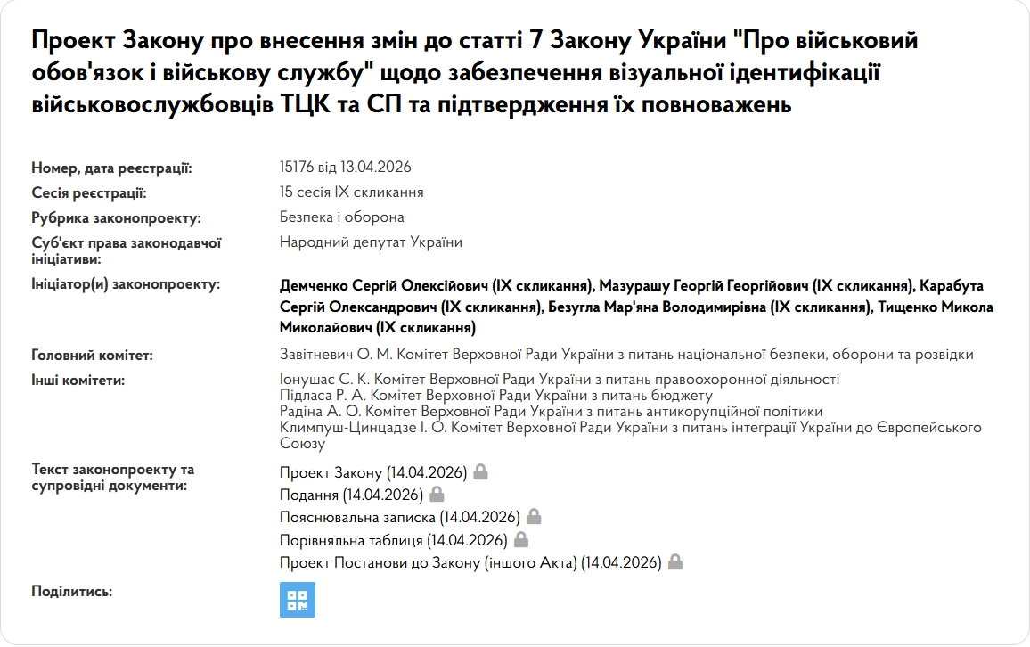 Під час звернення до громадян представники ТЦК повинні будуть називати своє прізвище і посаду та показувати службове посвідчення на вимогу. Також можуть стати обов’язковими нагрудні жетони з індивідуальним номером. Їх не можна буде знімати чи приховувати. Законопроєкт № 15176 про внесення змін до статті 7 Закону України “Про військовий обов’язок і військову службу” щодо забезпечення візуальної ідентифікації військовослужбовців ТЦК та СП та підтвердження їх повноважень, опублікований на сайті Верховної Ради.