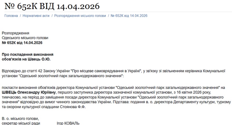 Тим часом тимчасовий виконувач обов’язків Одеського міського голови Ігор Коваль призначив тимчасово керувати зоопарком Олександру Швець, яка раніше очолювала приватний “Біопарк”, який фактично належить власнику одеського дельфінарія депутату міськради Андрію Кісловському. Низку депутатів Одеської міської ради обурило те, що призначення керівника зоопарку відбулося без конкурсу.
