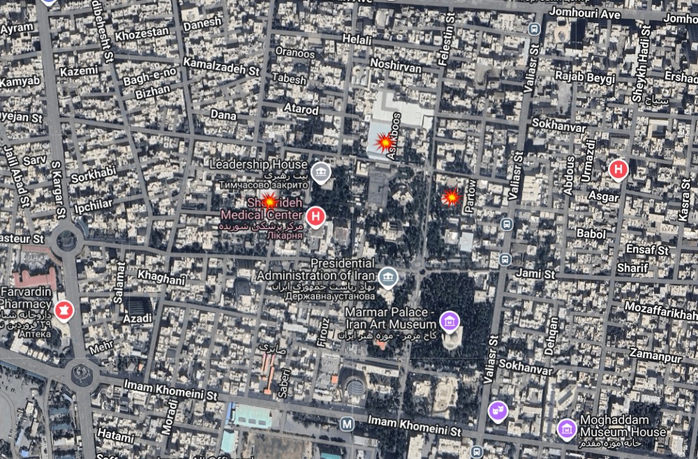 Тим часом OSINTери встановили координати точних влучань. Вказані три основні точки: перший стовп диму над епіцентром у перші 5 секунд відео — 35.691678, 51.397467, другий — 35.691758, 51.401955, третій — 35.692850, 51.400329.