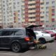 Яблука з Mercedes GLS продають серед багатоповерхівок. У багажнику кросовера запаковані ящики з фруктами, а частину з них розклали просто на тротуарі. Звертає на себе увагу і вінтажне покривало радянських часів.