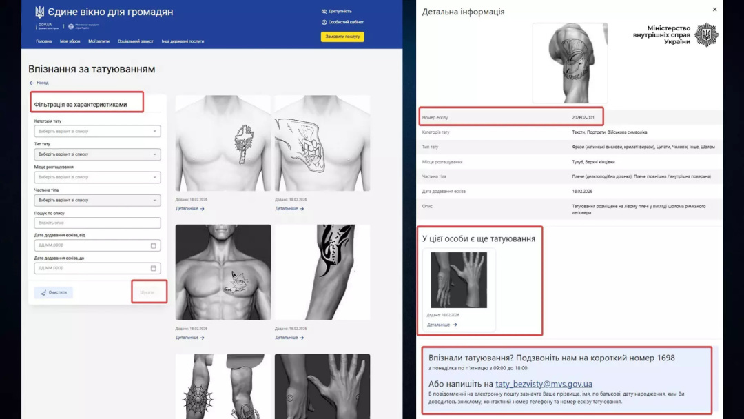 “Щоб пошук був зручним і швидким, у сервісі передбачено систему фільтрів: категорія татуювання (зокрема тексти, портрети, військова символіка тощо); тип татуювання (підкатегорія); місце розташування та частина тіла; пошук за описом”, – пояснив уповноважений.