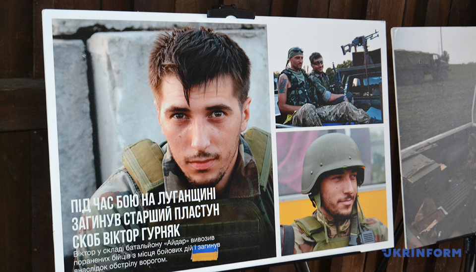 “Це нагороди нашого сина, які він отримав як волонтер та як військовий. Зокрема, орден “За мужність” 3 ступеня, звання Героя України, яке він отримав за те, що він евакуював багато поранених військових з поля бою. Також тут є каска, яку Віктор мав на Майдані, його фото у соняхах, яке він зробив під час повернення з Іловайська. Ми роздрукували багато фотографій з життя сина і запропонували учасникам фестивалю, хто себе впізнає на цих знімках, забрати їх з собою”, – розповів тато Віктора Петро Гурняк.