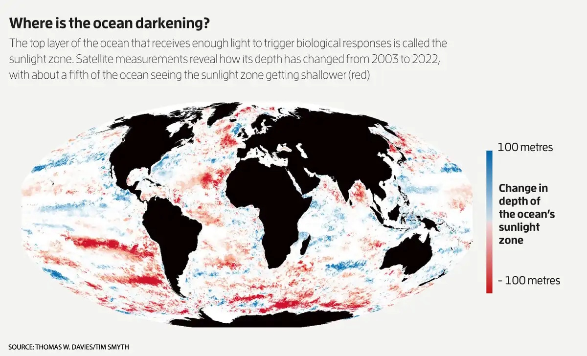 Вперше ця закономірність була виявлена вченими торік, і відтоді дослідники продовжують вивчати, як земні океани змінюються у відповідь на глобальне потепління планети, а також зміни в землекористуванні, і яку важливу роль відіграє в цих середовищах існування. Відкриття було зроблено, коли вчені проаналізували 20 років глобальних супутникових даних, щоб відстежити зміни оптичних властивостей океану — вони виявили стійкі закономірності потемніння. Простими словами, замість випадкових плям, розкиданих по всьому світовому океану, ці зміни утворюють великі взаємопов’язані регіони. Дані вказують, що приблизно п’ята частина світового океану потемніла тим чи іншим чином.
