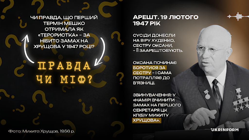 Повоєнний СРСР ніби виглядає досить привабливим, «переможців не судять», а частину «ворогів народу» відпускають на свободу. Передокс історії Оксани Мешко в тому, що свій перший радянський в’язничний досвід вона отримує у повоєнний час. То ж чи правда, що звинуватили Оксану у «тероризмі» та ще й у замаху на Хрущова?