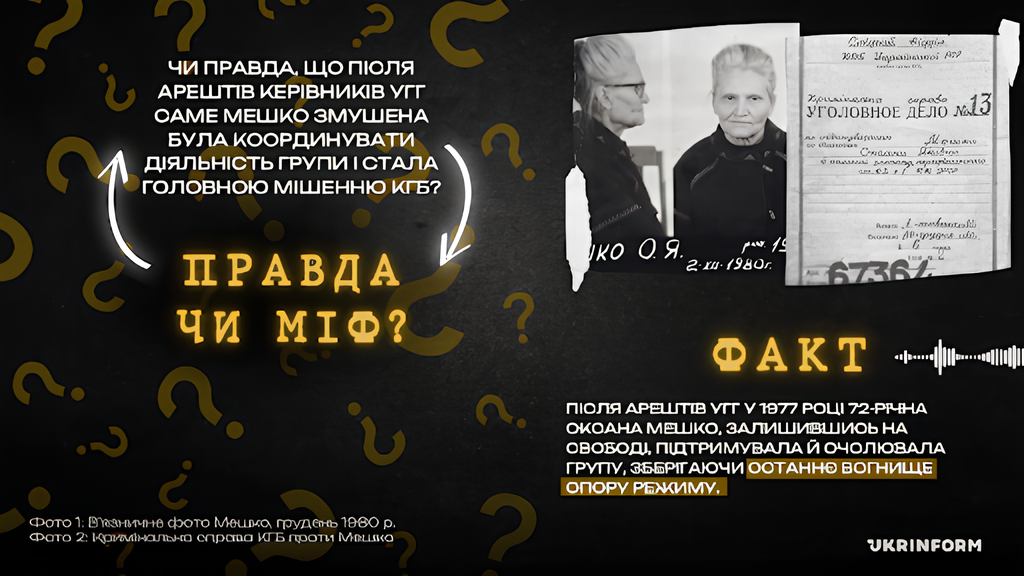 Оксана Мешко за фахом була хіміком, але її життєвим покликанням завжди був захист українства та дисидентів. Кажуть, що ідею створення Української Гельсінської групи вона зустріла словами: «Оце я вам буду друга». Не дивно, що лише за перші два роки діяльності групи у неї спецоргани СРСР провели 9 обшуків. Існує така теза, що Оксана Мешко змушена була у 1977 році очолити УГГ, оскільки всю «верхівку» групи КДБ заарештували, і вона єдина з вцілілих координувала і очолювала аж до арешту?