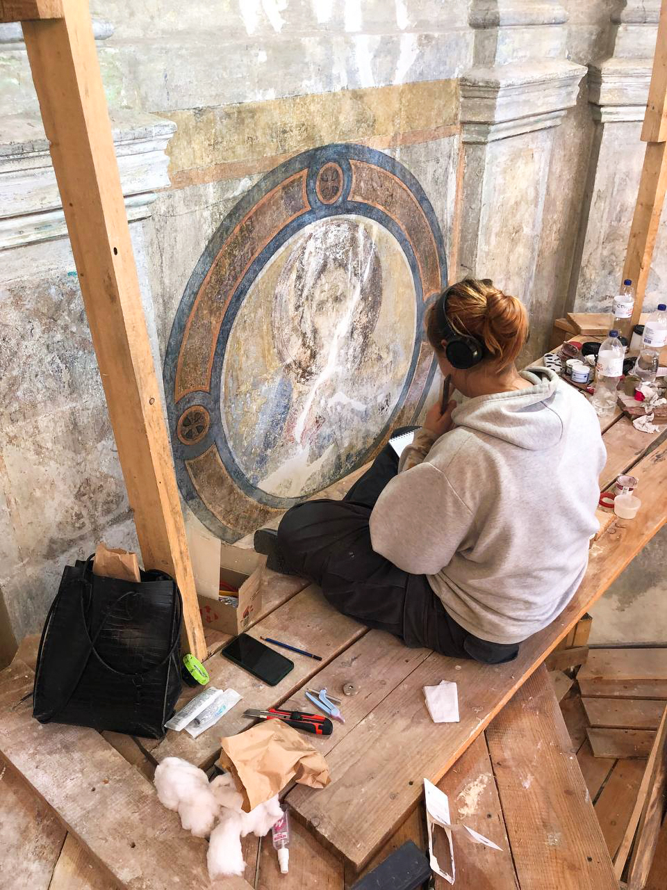 – Ми встановили риштування і почали досліджувати розписи на стінах, їхній стан. З’ясовували, які технології необхідно застосувати. Спершу зосередились на вивченні центральних нав та хорів храму, нижньої частини купола. Але, на жаль, на цьому етапі не знайшли нічого цінного. Був момент, коли навіть узялися готувати проєкт нових розписів, створювали початкові ескізи, – поділився Чередніченко.