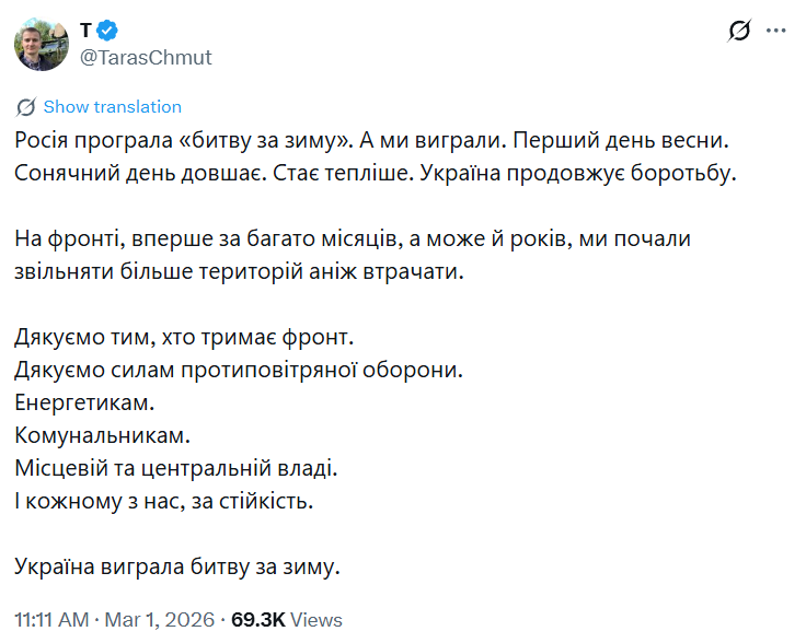 “Росія програла “битву за зиму”. А ми виграли. Перший день весни. Сонячний день довшає. Стає тепліше. Україна продовжує боротьбу”, — написав він.
