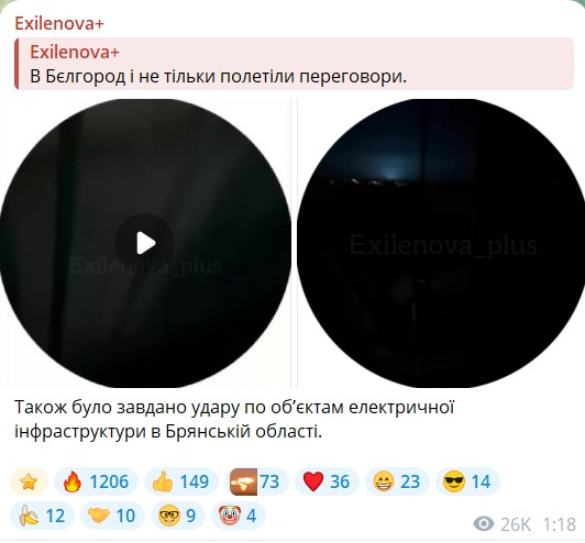 Тим часом у моніторинговому каналі Exilnova+ повідомили про надзвичайну ситуацію у Брянську. На кадрах з місця подій — панорама міста без світла. Публікація з’явилась о 1:38 4 лютого і вказано, що подія відбулась у Брянську, через дві години після блекауту у Бєлгороді.