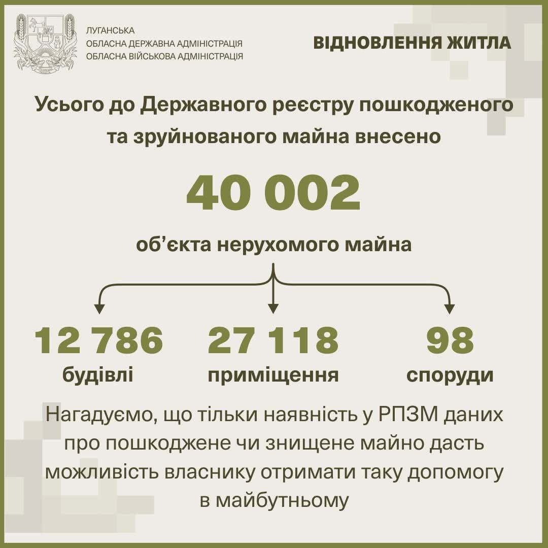 Усього до Реєстру пошкодженого та знищеного майна (РПЗМ) внесено 40 002 об’єкти нерухомого майна, у тому числі 12 786 будівель, 27 118 приміщень та 98 споруд.