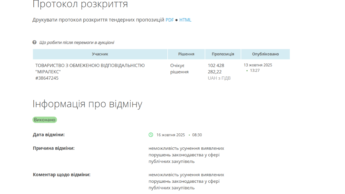 Проте під час перевірки виявили невідповідність між проєктною документацією та кошторисом, затвердженим експертним звітом. Через це усунути порушення було неможливо, а проведення тендеру виявилося незаконним. У зв’язку з цим замовник ухвалив рішення про скасування закупівлі відповідно до Закону “Про публічні закупівлі”.