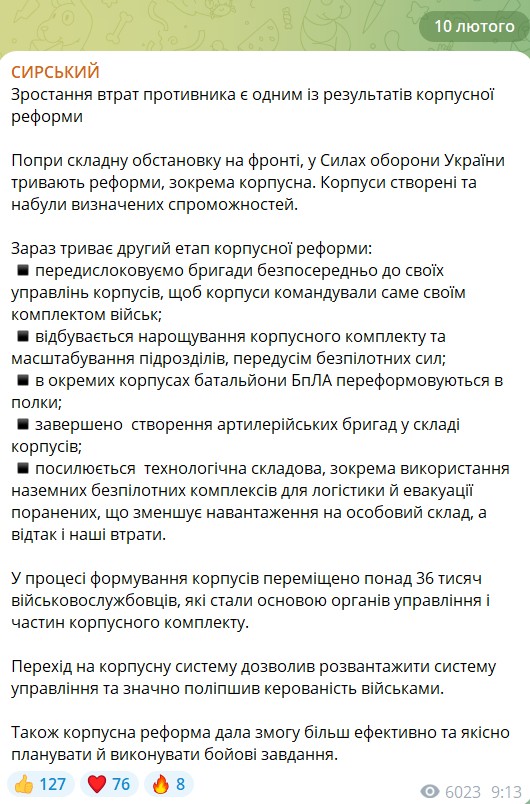 Перехід на корпусну систему дозволив розвантажити систему управління та значно поліпшив керованість військами, зазначив Сирський.