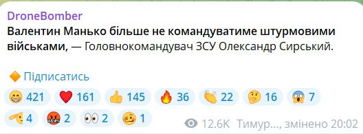 На сторінках Генштабу та головнокомандувача Сирського відсутнє підтвердження про кадрові зміни у штурмових військ і про звільнення полковника Манька. Останні дописи головнокомандувача — про те, що Сили оборони у січні підняли кількість втрат ЗС РФ до 31 тис. осіб, тим часом як кількість контрактників у російській армії на 9 тис. менша. У ранковому повідомленні, яке з’явилось зранку 10 лютого, — розповідь про деталі корпусної реформи, у ході якої перемістили 36 тис. бійців, створили артилерійські бригади у складі корпусів та масштабують батальйони БпЛА у полки: про зміни у штурмових військах не згадується.