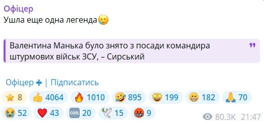 На дописи про Манька відреагували також Z-блогери РФ. Зокрема, у каналі одного з військкорів-пропагандистів написали, що Манька могли звільнити у зв’язку з “контрнаступом” у Запорізькій області.