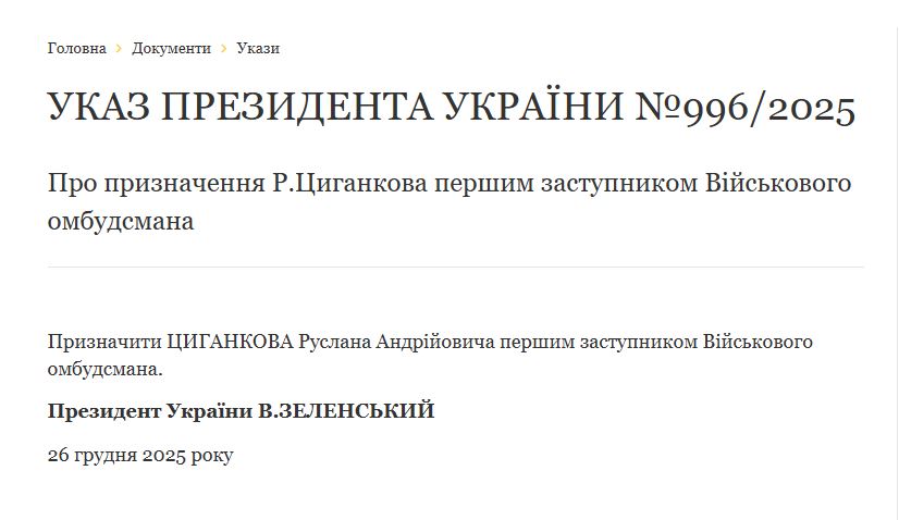 “Призначити Циганкова Руслана Андрійовича першим заступником військового омбудсмана”, – йдеться у повідомленні.