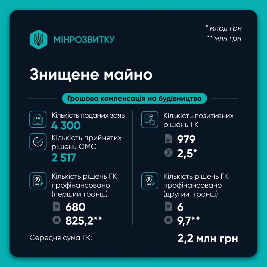 За даними міністерства, за пошкоджене майно для понад 114 тис. родин виплачено 11,1 млрд грн, з яких 7,2 млрд грн – виплати за дрібні ремонти (категорія А), 3,2 млрд грн – за капітальні. Середні суми компенсацій становили 71 200 грн та 341 800 грн відповідно.