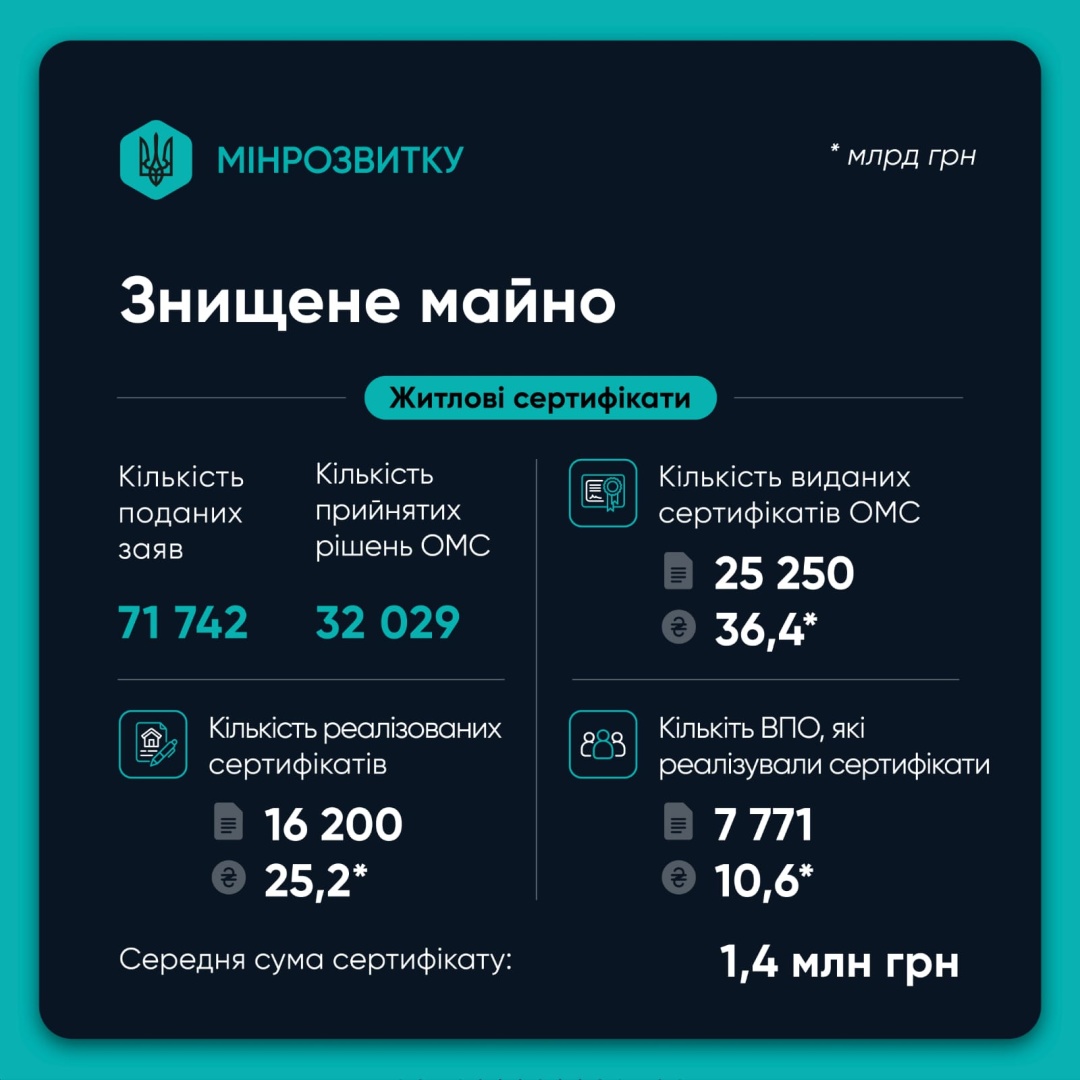 Житлові сертифікати для придбання житла замість знищеного отримали понад 25 тис. родин на загальну суму 36,4 млрд грн. При цьому вже придбали нове житло більше 16 тис. сімей, з них понад 7,7 тис. – родини ВПО. Середня сума сертифіката становить 1,4 млн грн.