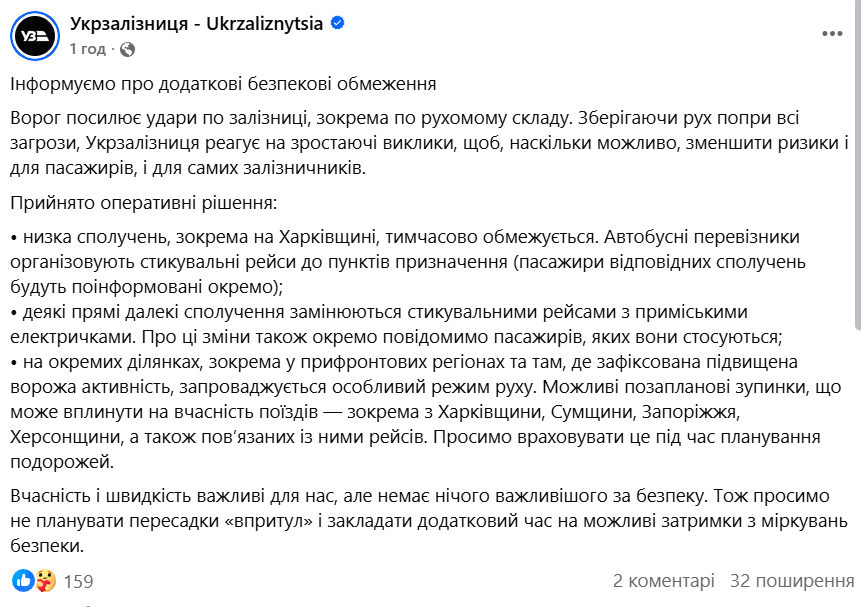 “Вчасність і швидкість важливі для нас, але немає нічого важливішого за безпеку. Тож просимо не планувати пересадки “впритул” і закладати додатковий час на можливі затримки з міркувань безпеки”, — звернулися в “Укрзалізниці” до українців.