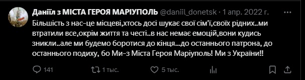 «Можливість була вийти, але як я буду дивитися в очі своїм побратимам, з якими стою пліч-о-пліч? Тож будемо боротися до кінця! Маріуполя більше немає, є тільки руїни і більше нічого. На це дуже боляче дивитися, але це і не дає кинути зброю», – повідомив чоловік.